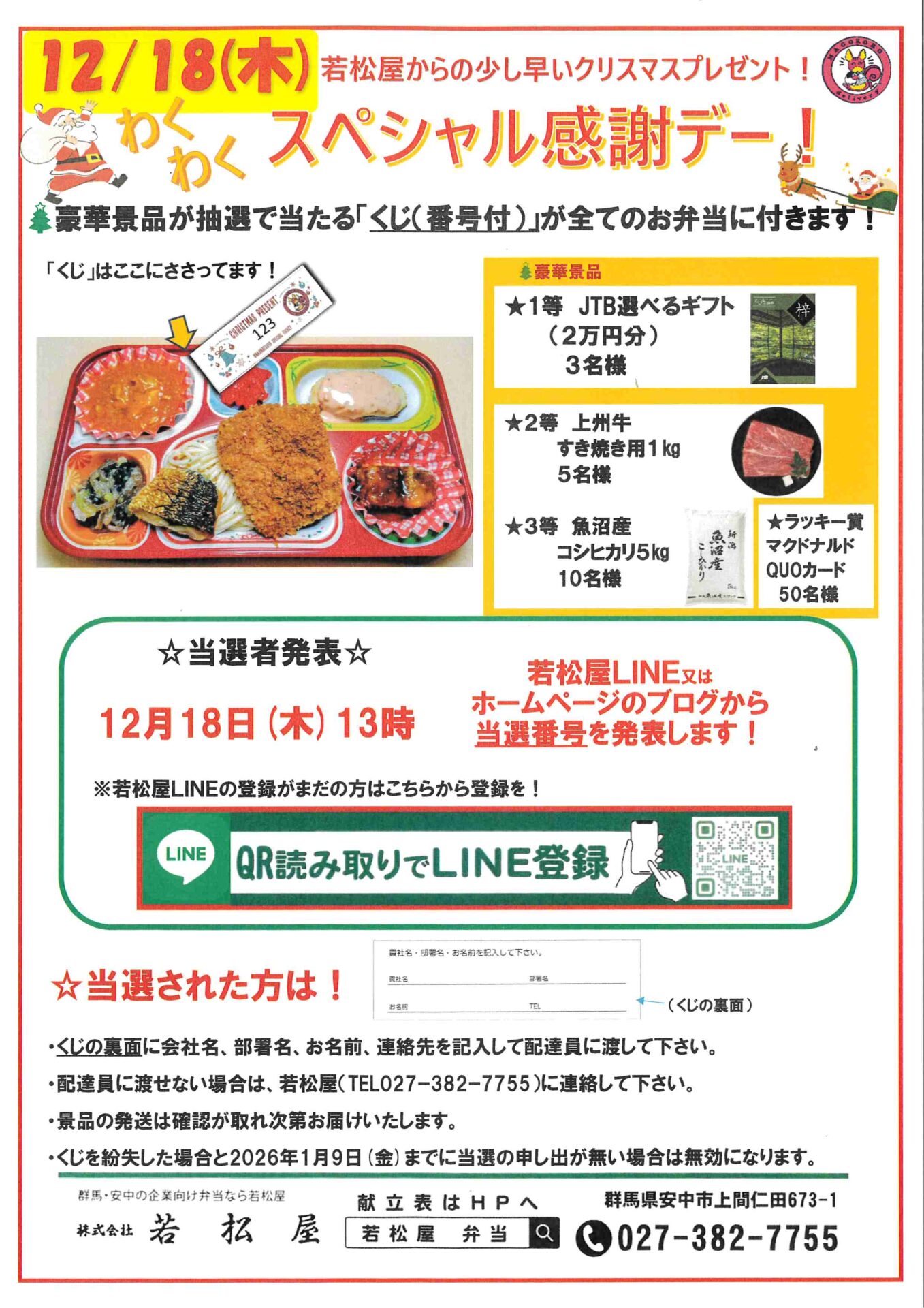 12月18日(木)は「わくわくスペシャル感謝デー!」豪華景品が当たるチャンス!! 2025.12.14 群馬県安中市!お弁当の若松屋です!12月18日(木)は「わくわくスペシャル感謝デー!」豪華景品が当たるチャンス!!🎄若松屋からの少し早いクリスマスプレゼント!!日頃の感謝を込めて!いつものお弁当に「クジ」が入ってます!☆旅行券・高級肉・お米etcの豪華景品が当たるチャンス!!詳細はこちら⇩ たくさんのご注文!お待ちしております!!