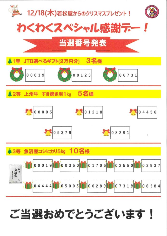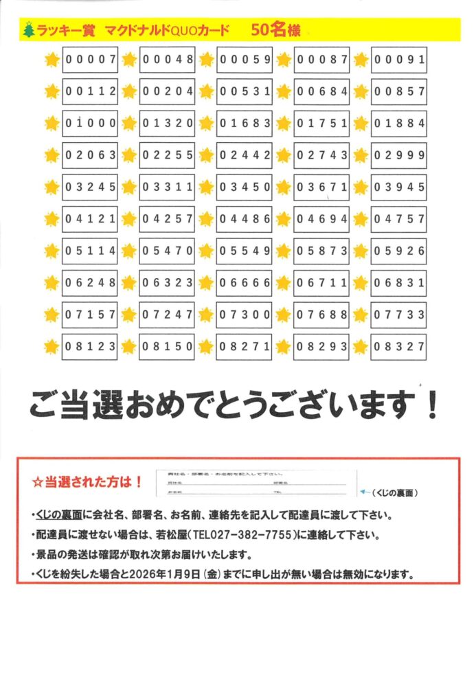「わくわくスペシャル感謝デー!」当選番号発表!! 2025.12.18 群馬県安中市!お弁当の若松屋です!! 本日はたくさんのご注文をいただき、誠にありがとうございました!☆豪華景品が抽選で当たるチャンス!!当選番号の発表です!!⇩