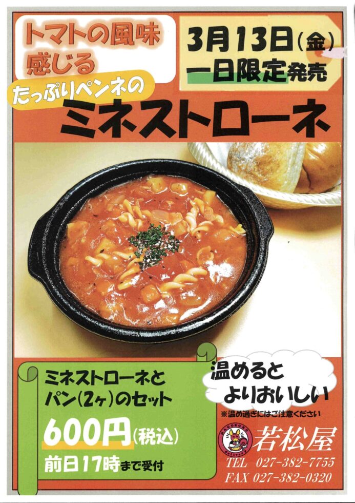 トマトの風味感じる『ミネストローネ』‼️3/13(金)一日限定発売!ご注文受付中! 2026.03.112026.03.09 群馬県安中市!お弁当の若松屋です! トマトの風味感じる!たっぷりペンネ! 『ミネストローネ』‼️ 💫3月13日(金)【一日限定発売】 ※パン(2ヶ)セット:600円(税込) 💫ご注文受付中!
